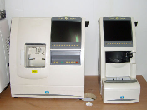 The Kappa automatically positions the stylus in the frame and traces both eyes in less than 20 seconds, at the same time determining the frame DBL. After tracing, the lens is placed in the blocker. A video camera captures and displays an image of the lens, without parallax, along with the frame shape. The operator aligns the lens and checks cutout. Block application is motorized and fully automatic.